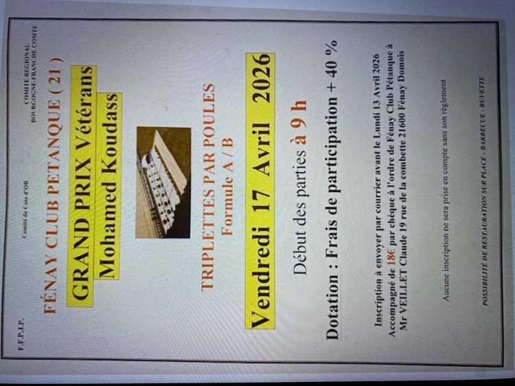 Triplette VETERAN Challenge KOUDASS à FENAY - Mises + 40%Inscription à envoyer par courrier avant le lundi 13 avril 2026,noms et numéros de licenceAccompagnée de 18€ par chèque à l'ordre de Fenay Club Pétanque à M. Claude VEILLET, 19 rue de la Combette - 21600 - FENAY DOMOISPrésident : Jean MONNOT