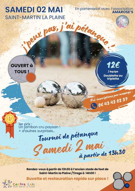 Le Centre Laïc vous propose la quatrième édition de son tournoi de pétanque ! 🥳☀️😎👉 Rendez-vous le samedi 2 mai, sur l'ancien stade de foot de Saint-Martin la Plaine à partir de 13h30.🛑 Les tirages débuteront dès 14h00 !👉Doublette ou triplette, le prix sera de 12€ par équipe.📝 Pré-inscription par message au : 06 50 29 11 85🍺🥤🌭 Buvette et restauration sur place👋 Bien entendu, le tournoi est ouvert à tous et toutes !