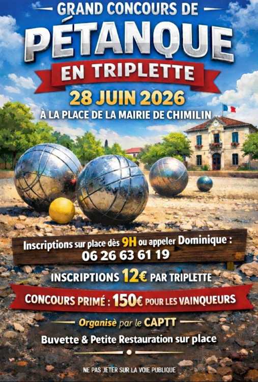 Concours de pétanque triplette organisé par le CAPTT ( tennis de table Chimilin / Les Abrets / Le pont de Beauvoisin.Inscription auprès de Dominique 0626636119Inscription à partir de 9hBuvette / snack Gain 150€