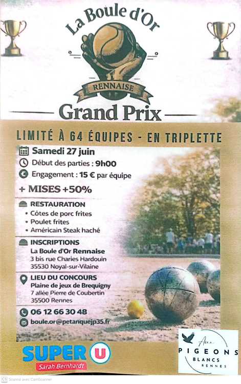 Concour licencié en triplette mise +50 début des parties 9h. Engagement 15€ par équipe inscription la boule d'or rennaise 3 bis rue Charles hardouin 35530 Noyal sur vilaine. Restauration sur place