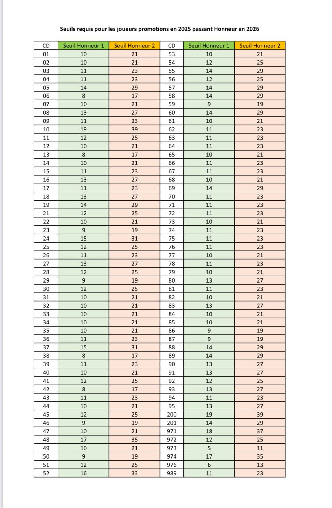 Seuils par département pour passer de Promotion à Honneur pour la saison 2026 : ce qu'il faut savoir 🎯📈La FFPJP (Fédération Française de Pétanque et Jeu Provençal) vient tout juste de publier les seuils des points nécessaires pour les joueurs Promotion en 2025 passant Honneur en 2026 ! 🏆Honneur 1 signifie que vous serez Honneur pendant 1 an.Honneur 2 signifie que vous serez Honneur pendant 2 ans.A savoir que seuls vos points catégorisés seront pris en compte pour monter.Félicitations à tous ceux qui montent ! 🍾👏