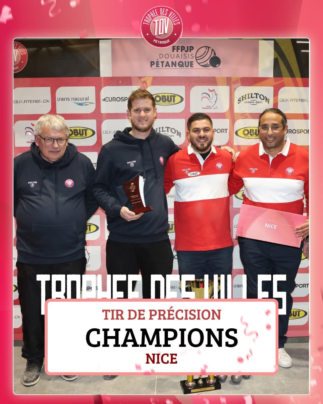 Le Trophée des Villes 2024 s'est déroulé au Boulodrome du Douaisis du 09 au 12 Janvier 2025 !Cette compétition regroupe les meilleurs joueurs répartis dans plusieurs villes de France.Voici les résultats🎯 Tir de précisionMickaël BONETTO s'offre le tir de précision face à Yohan COUSIN sur le score de 47 à 24 en finale !C'est donc l'équipe de Nice qui récupère le trophée pour cette année ! 💪🏆 Trophée des villesLa finale oppose La Crau à Fréjus.L'équipe de La Crau : Henri LACROIX, David DOERR, Laurent et Lenzo MATRIGLIAL'équipe de Fréjus : Diego RIZZI, Dylan ROCHER, Stéphane ROBINEAU et Adrien DELAHAYELa Crau et Fréjus gagnent chacun une doublette et c'est donc la triplette qui va être décisive 🔥.Face aux bombardiers côté Fréjus, La Crau ne réussit à marquer que 4 points sur la triplette !Fréjus empoche donc une nouvelle fois le titre du Trophée des Villes 2024 💪Félicitations à toutes les équipes pour leurs performances et leurs niveaux de jeu !Profitons-en pour remercier tous les bénévoles qui ont donné de leurs temps pour la réussite de ce bel évènement !Rendez-vous l'an prochain pour une nouvelle édition et de belles parties ❤️