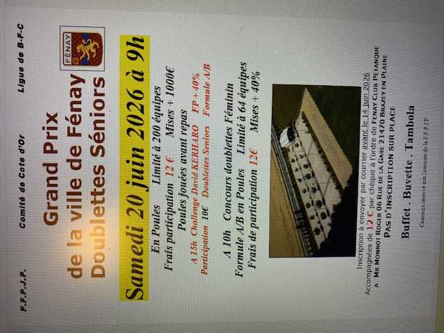 Fénay Club Pétanque organise un doublette FEMININ , formule A / B en poules - Mises + 40% limité à 64 équipes Inscription à envoyer par courrier avant le 14 juin 2026,Accompagnée d'un chèque de 12€ à l'ordre de Fenay Club Pétanque à M. Roger MONNOT, 6, rue de la Gare, 21470 BRAZEY EN PLAINE Président : Jean MONNOT petanquedefenay@gmail.com