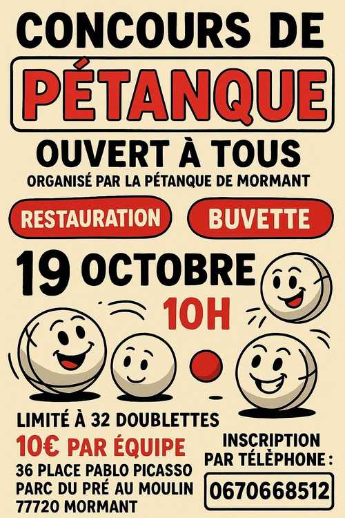 🎉⚫️⚪️ Concours de pétanque à Mormant ⚪️⚫️🎉La Pétanque de Mormant organise son concours ouvert à tous 👉 le dimanche 19 octobre à 10h au Parc du Pré au Moulin (36 place Pablo Picasso, 77720 Mormant).👉 10 € par équipe (limité à 32 doublettes)👉 Restauration & buvette sur place 🍔🥤👉 Ambiance conviviale garantie !📞 Inscription par téléphone : 06 70 66 85 12On vous attend nombreux pour partager un super moment autour du jeu et de la bonne humeur 🤩 !