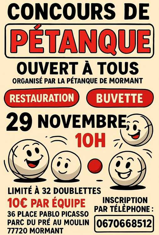 🎯 Concours de Pétanque à Mormant ! 🎯Ouvert à tous — venez passer un super moment convivial 🥳📅 samedi 29 novembre à 10h📍 Parc du Pré au Moulin, 36 place Pablo Picasso – 77720 Mormant💰 10€ par équipe (doublette)🍔 Restauration et buvette sur place⚡ Places limitées à 32 équipes !👉 Inscriptions au 06 70 66 85 12Venez nombreux pour partager une journée de bonne humeur et de belles parties de pétanque ! 🔵🔴⚪