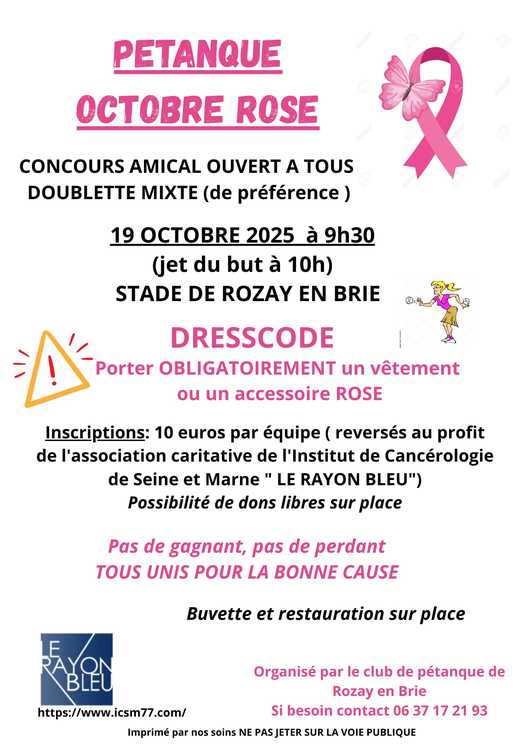 OCTOBRE ROSE A LA PETANQUEConcours amical ouvert à tous Doublette mixte de préférence L ensemble des inscriptions seront reversés à l association caritative de l Institut de Cancérologie de Seine Et Marne ( LE RAYON BLEU).