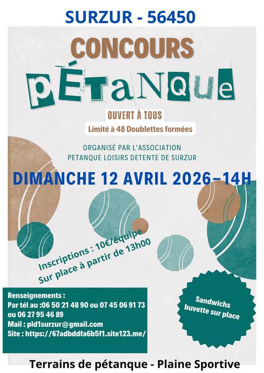 L'association Pétanque Loisirs de Surzur organise un concours ouvert à tous le Dimanche 12 avril 2026 à 14h00 en doublette formée.Inscriptions sur place à partir de 13h00.10€/équipeJet du premier but à 14h00Buvette et vente de sandwichs