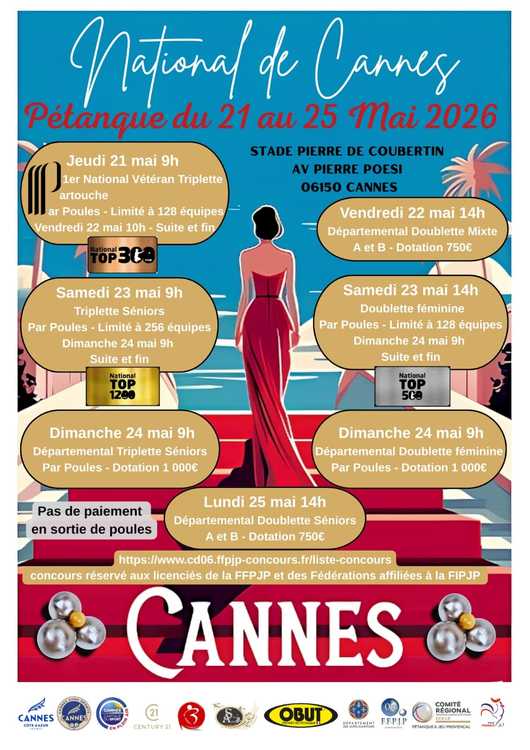 FÉMININ DOUBLETTE, Frais d'inscription/pers : 15 € - Pas de paiement sortie de poule, CANNES AEROSPORTS, Mme Patricia LOMBARDO - 06 24 69 09 85, cannesaerosports@free.fr, Par poules, Limité à 128, 23 et 24 mai 2026, 14h00