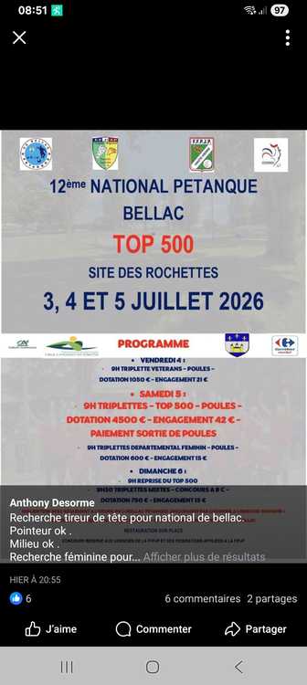SÉNIOR TRIPLETTE OPEN, Frais d'inscription/pers : 12 € - Paiement sortie de poule, CS BELLAC PETANQUE, Mr Dominique GERBAUD - 06 13 03 48 51, csbellac.petanque@hotmail.fr, Par poules, Limité à 256, 4 et 5 juillet 2026, 9h00