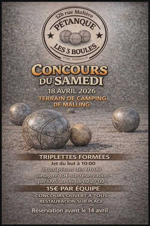 Plat UNIQUE Lasagne 10€ sur réservation avant le 14 avril par SMS au 06 66 62 27 02- Places limitées, Inscriptions par mail : les3boules57@gmail.com ou SMS au 06 66 62 27 02Pétanque Les trois boules AU TERRAIN DE CAMPING